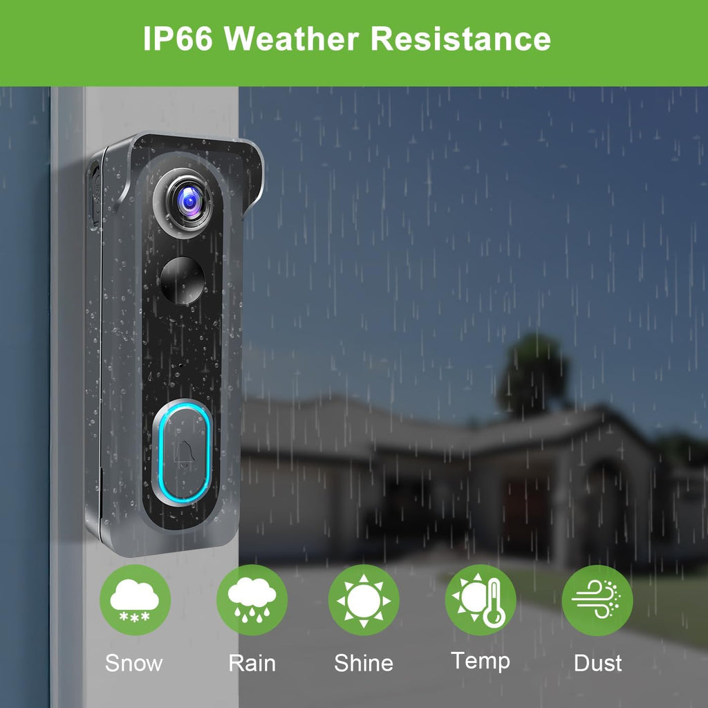 - 【2K HD Crystal-clear Video: & IR Night Vision & IP66 Waterpoorf】See and speak to visitors and couriers through 2K hd camera and 166° wide angle. it will let you enjoy industry-leading video clarity and super night vision up to 33ft, always see clearly in darkness . The doorbell protects your home from day to night. With an IP66 material casing, The wireless video doorbell is water and dust resistant and offers incredible standby time and long lasting performance.